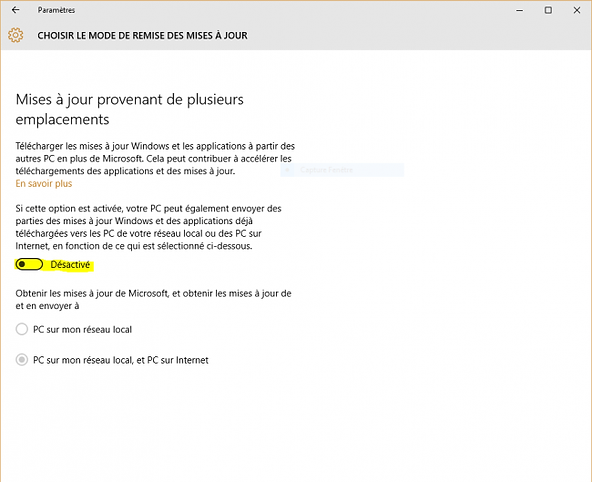 Étape 3 : Ensuite, vous pouvez au choix désactiver l'option de mise à jour en provenance de plusieurs emplacements OU alors laisser l'option activée en prenant soin de cocher "PC sur mon réseau local". Ça vous permettra de profiter de la fonctionnalité uniquement pour tous vos ordinateurs sur le même réseau sans plomber votre bande passante internet.